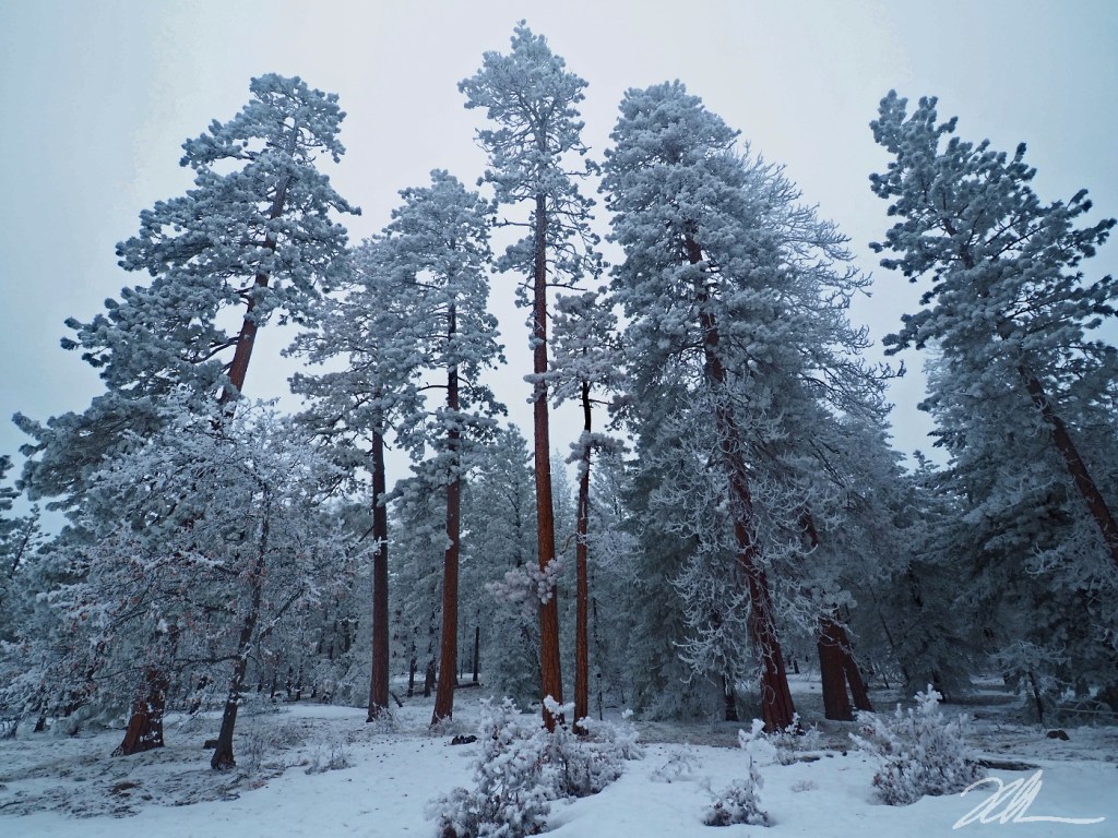 Unlike a silver thaw where freezing rain covers trees in a glaze of clear ice, these Ponderosa are flocked with delicate ice crystals that continue to grow as fog conditions persist – sometimes up to 2 inches in length. The stillness of the fog is a secret ingredient, however, as even the slightest wind will bring them down in a blizzard of fine crystals.