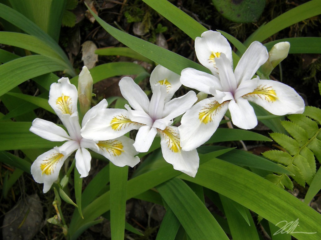 Image Description: A trio of white iris bloom in a diagonal line, accented with narrow yellow throats. The blooms are framed by bright green, strap-shaped iris foliage. A neighboring fern sneaks a frond into the right side of the image.